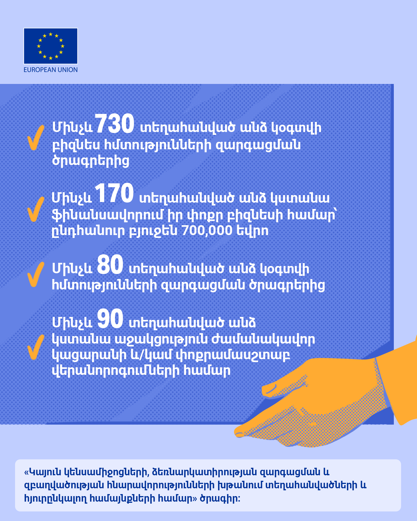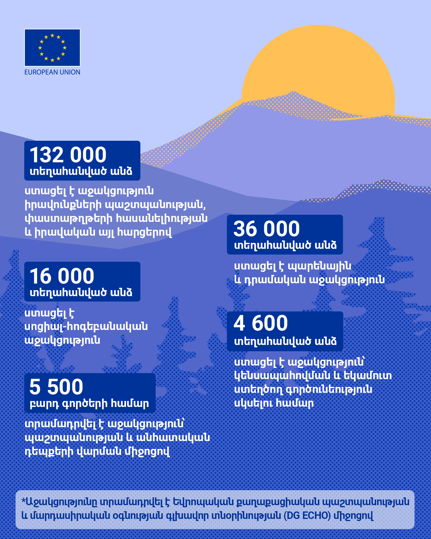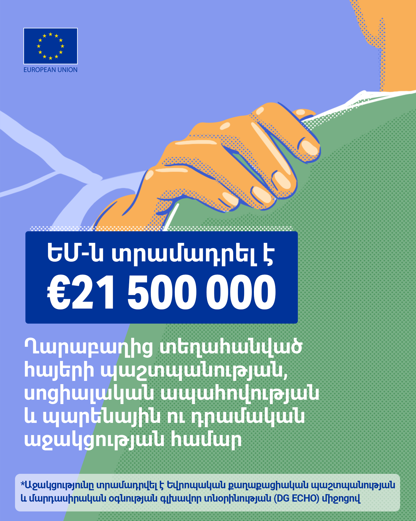 Of the total amount, €21.5 million was provided through the Directorate-General for European Civil Protection and Humanitarian Aid Operations (DG ECHO), €40 million as EU budget support to the Republic of Armenia, €9 million for programmes implemented by civil society organisations (CSOs), and €8 million for the Refugee Response Window for Armenia (RRWA), implemented by the European Bank for Reconstruction and Development. Learn the details on the support below.
