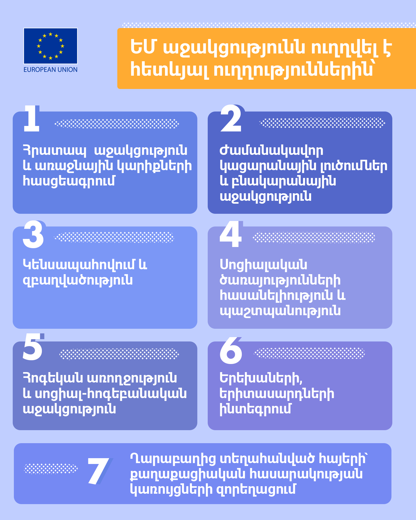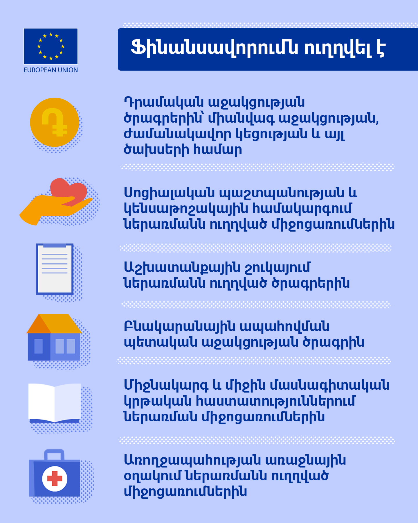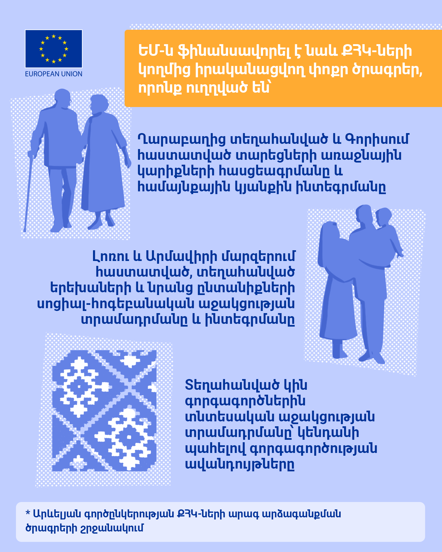 Of the total amount, €21.5 million was provided through the Directorate-General for European Civil Protection and Humanitarian Aid Operations (DG ECHO), €40 million as EU budget support to the Republic of Armenia, €9 million for programmes implemented by civil society organisations (CSOs), and €8 million for the Refugee Response Window for Armenia (RRWA), implemented by the European Bank for Reconstruction and Development. Learn the details on the support below.
