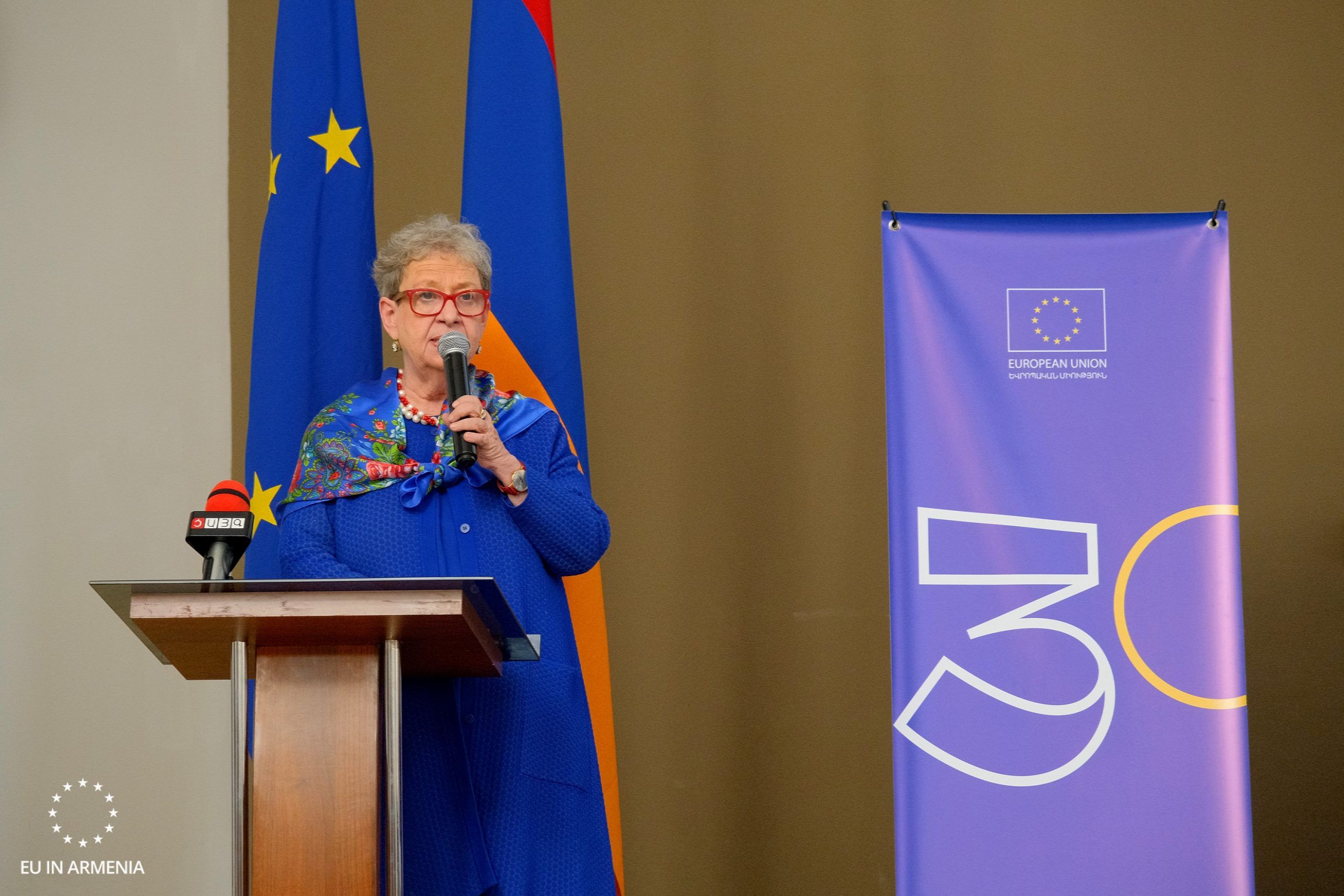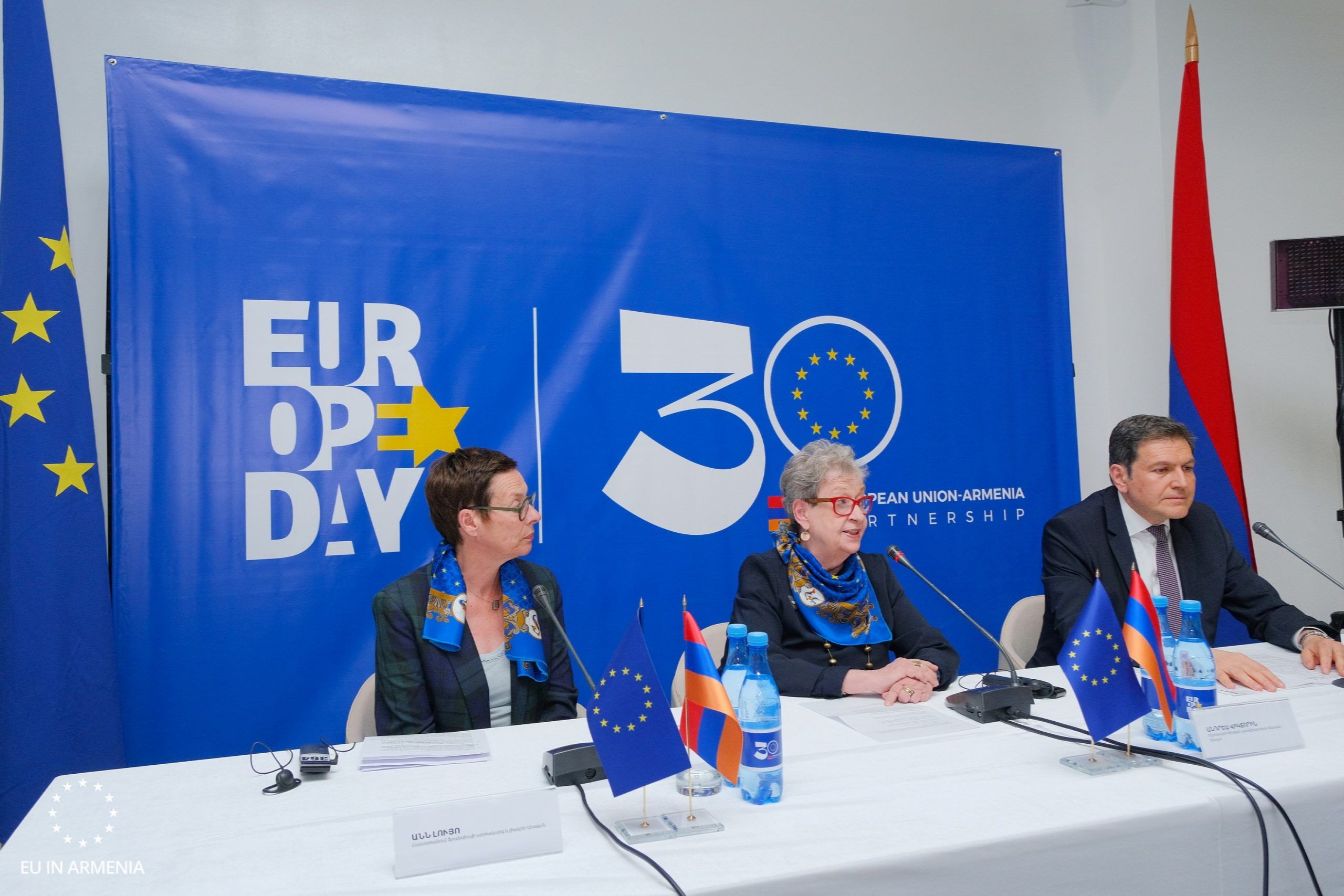On May 10, a press conference was organised. The Head of the EU Delegation to Armenia, Ambassador Andrea Wiktorin, the Deputy Minister of Foreign Affairs of the Republic of Armenia Paruyr Hovhannisyan, and Ambassador of France to Armenia Anne Louyot ) summed up the 30-year activity and spoke about the future plans.
