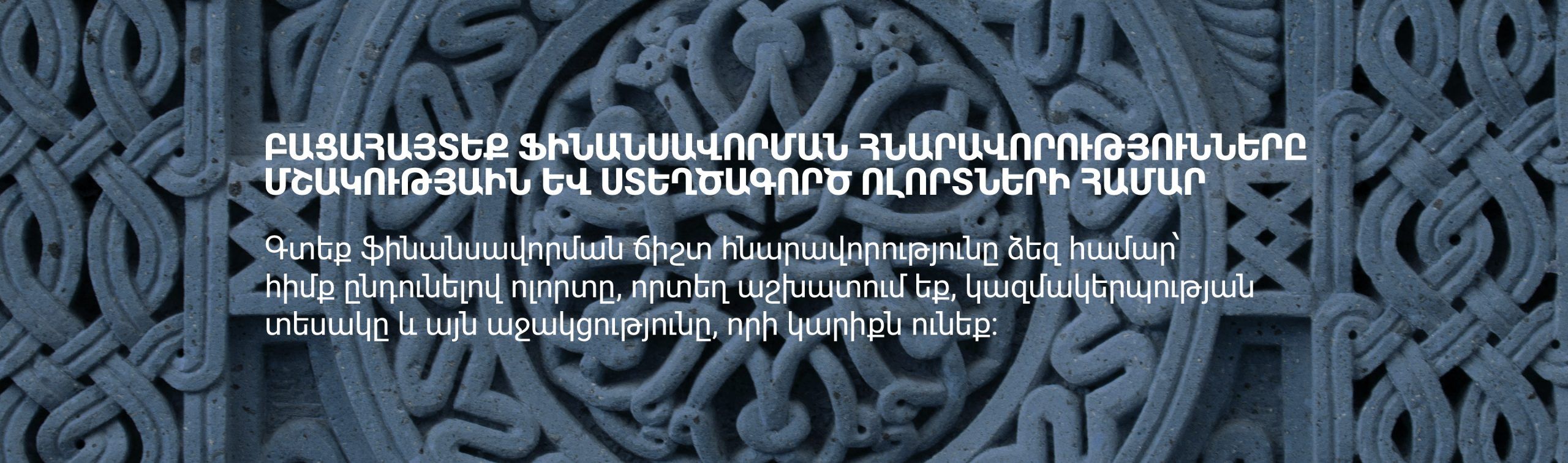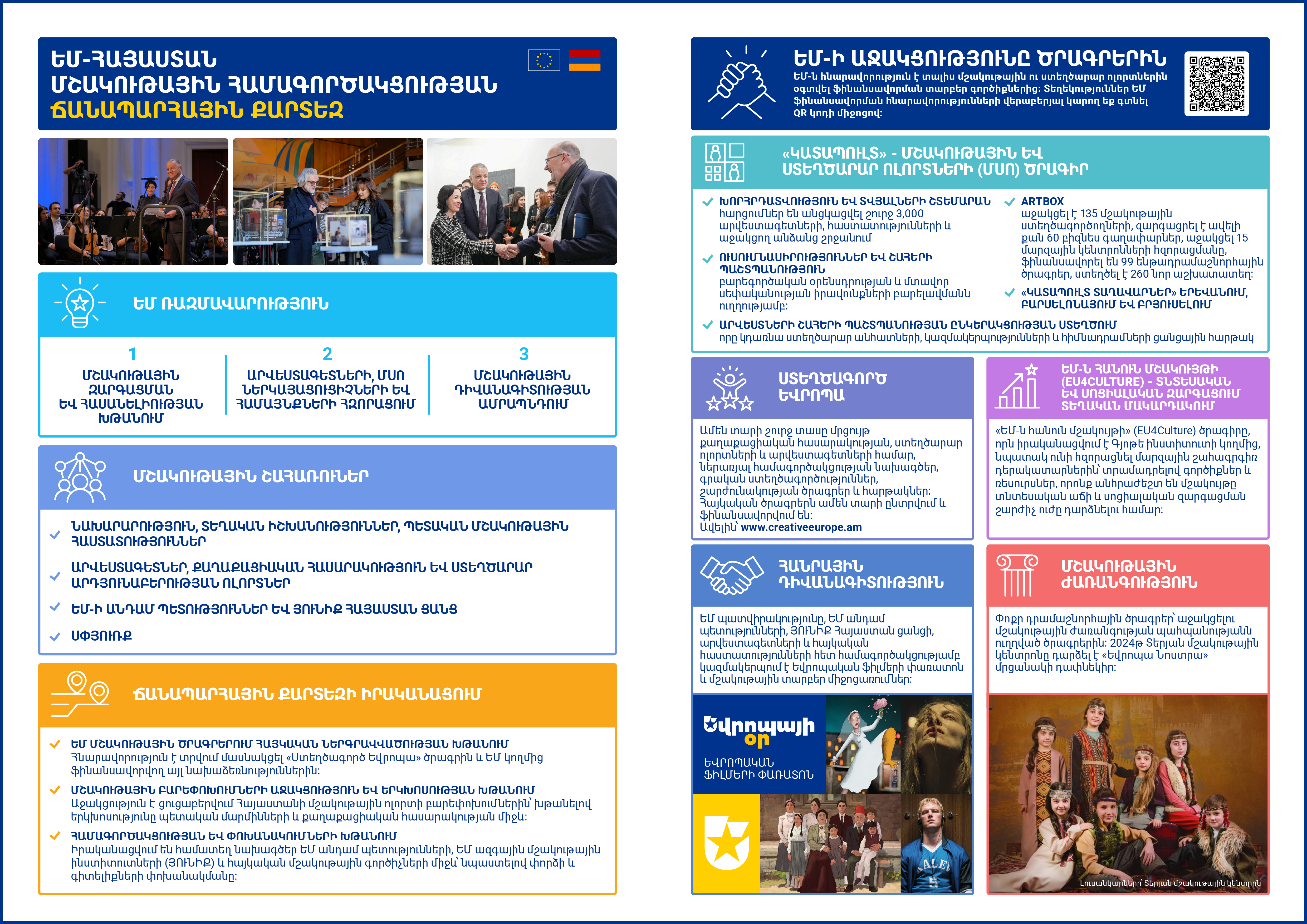 Եվրոպական հաստատությունները նպաստում են մշակութային և ստեղծարար ոլորտների համար Եվրոպական միության բոլոր ֆինանսավորման աղբյուրների հասանելիությանը։ Նպատակն է օգնել այս ոլորտների ներկայացուցիչներին գտնել իրենց գաղափարների և նախաձեռնությունների համար ԵՄ աջակցության ամենահարմար աղբյուրը։