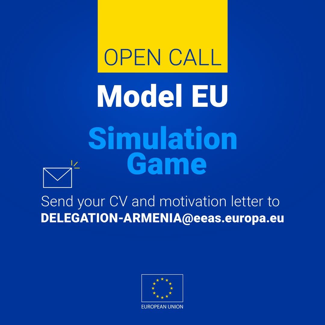 If you are interested, send your CV and a motivation letter (up to 500 words) to DELEGATION-ARMENIA@eeas.europa.eu with “Model EU Application” as the subject.